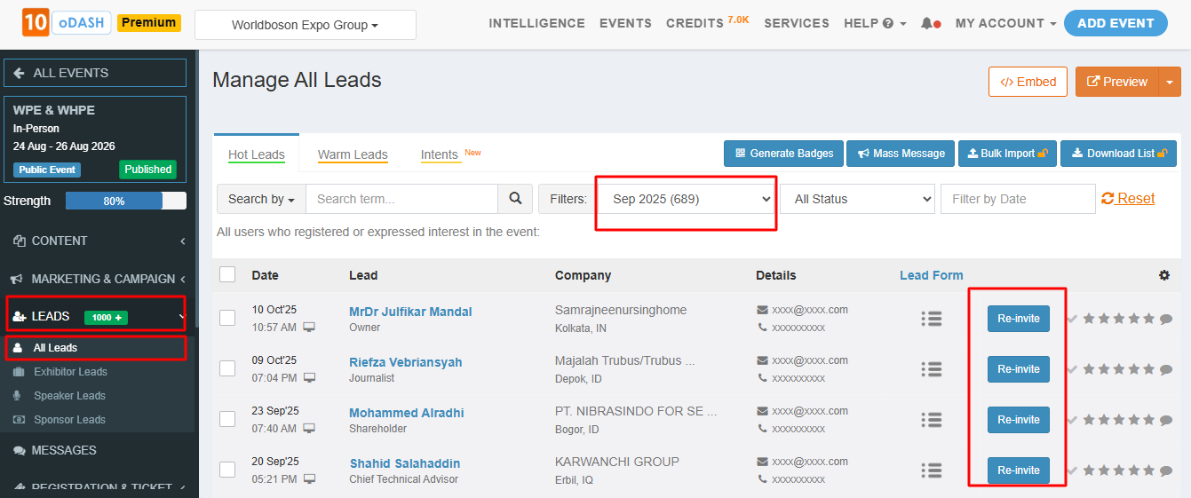 The Organiser Dashboard (oDASH) allows you to effectively use credits to reach a wider audience and generate high-quality leads. You can redeem credits to send email invites, connect with user intents, send mass messages, and re-engage past attendees.