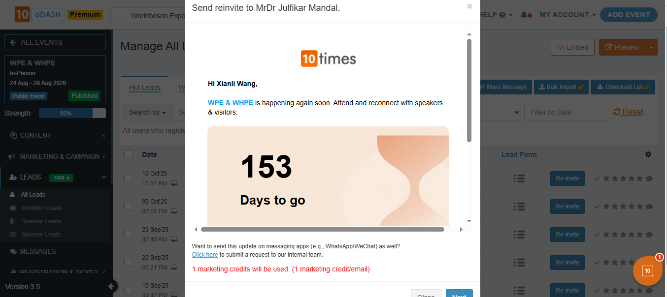 Use credits to reach potential leads from the 10times user base