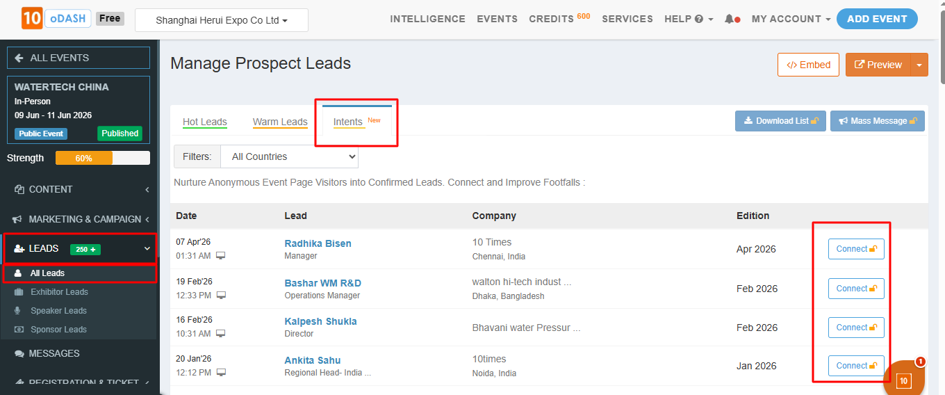 Intents shows the data of the users who have anonymously visited your event page but have not registered to the event. Connect with them to convert them into confirmed leads.